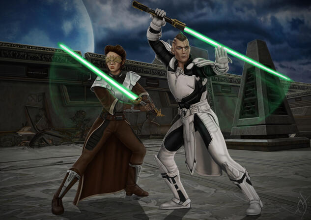 During the course of an investigation into a series of mysterious disappearances of Jedi Knights and Masters, both Sarait and Tyrusso were captured and mind controlled by a powerful Sith Artefact. The two were the last standing in the confrontation when the Aurora Core found the errant faction Zakuulan Scions & Knights responsible for the disappearances.The Zakuulans were acting under the influence of the ancient sith Darth Nalar, who had trapped his own spirit in a holocron of his making. When the artefact, a mass mind control device, was destroyed, it acted as a catalyst and amplifier to a force bond already forming between the masters. The result was an unusually powerful force bond the two have been forced to adapt to, and learn to live with.While the bond is not secret, both Masters try not to draw attention to it for two primary reasons. The most important being that the bond could be used against one or the other. The second being the unfortunate, and incorrect, assumptions that are sometimes made about the nature of their relationship.